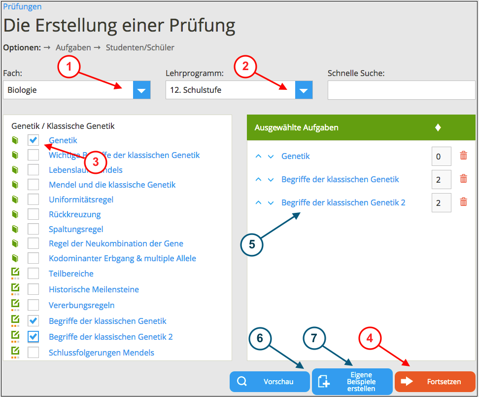 4. Um die Prüfung zu erstellen, klicken Sie auf "Fortsetzen" ④.