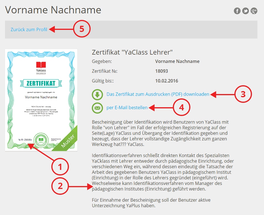 - das Zertifikat herunterzuladen und auszudrucken — kostenlos für alle Lehrer mit dem YaPlus-Abonnement ③